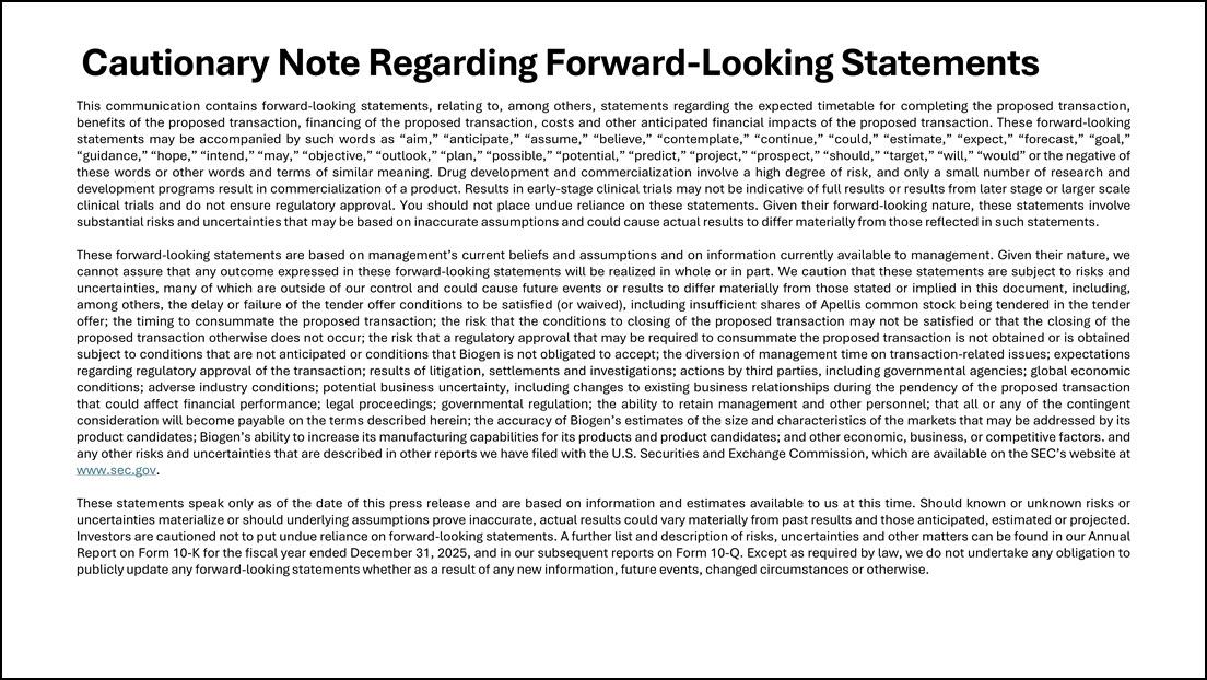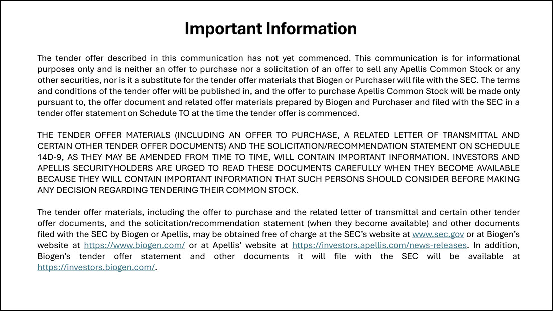 Stock or any other securities, nor is it a substitute for the tender offer materials that Biogen or Purchaser will file with the SEC. The terms and conditions of the tender offer will be published in, and the offer to purchase Apellis Common Stock
